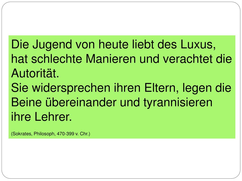 Unsere jugend liebt den luxus, hat schlechte manieren, mißachtet die autorität und hat keinen respekt vor dem alter. Die jugend liebt heutzutage den luxus. Die jugend liebt heutzutage den luxus. Schon sokrates soll geklagt haben: Die jugend liebt heute den luxus.